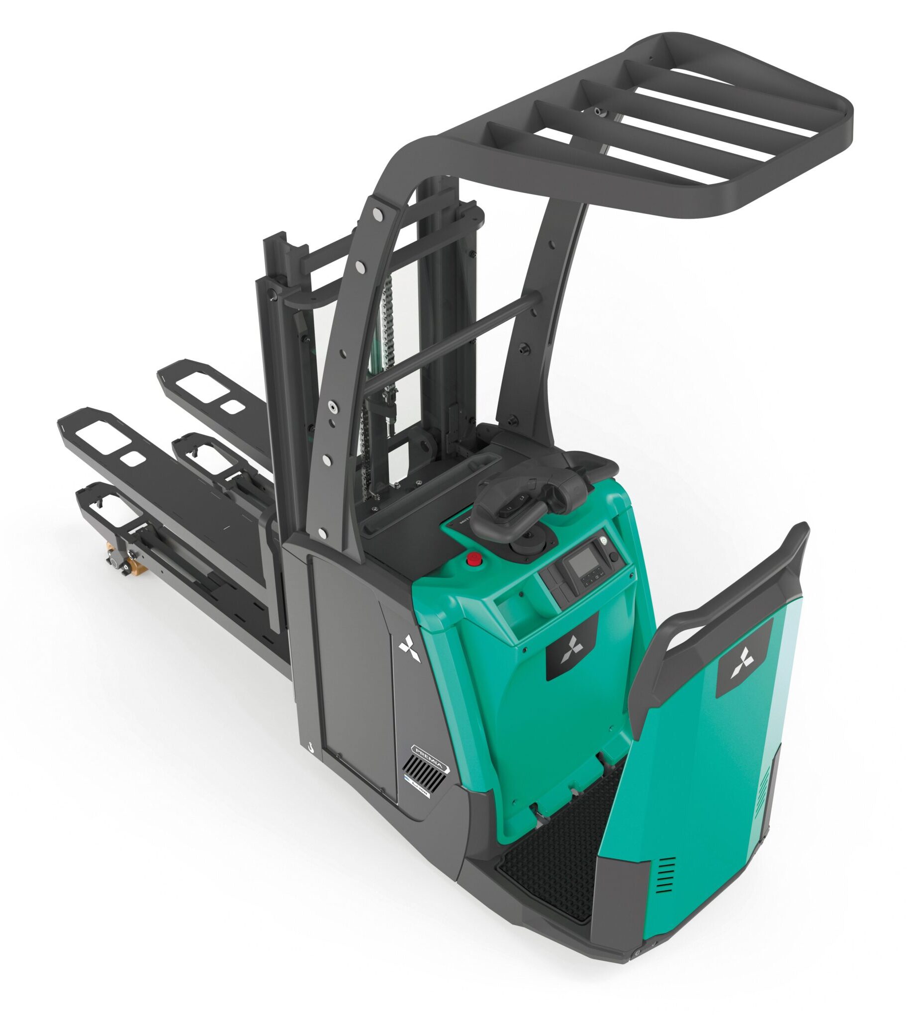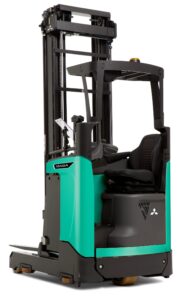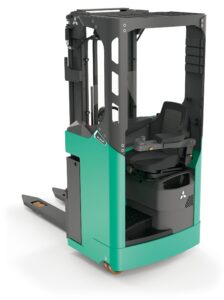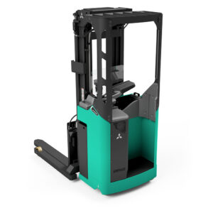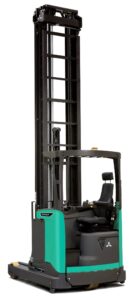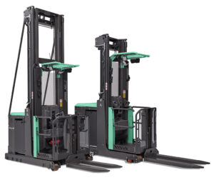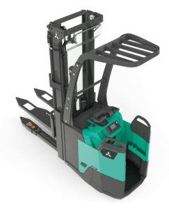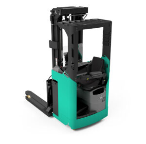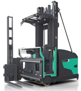 Carretilla VNA ergonómica y configurable, con controles intuitivos, visibilidad excelente y optimizada para picking en pasillos estrechos.