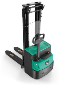 Apilador de conductor de pie, eficiente y seguro, maximiza espacio, facilita manipulación flexible, ofrece visibilidad, alto rendimiento y fácil mantenimiento.